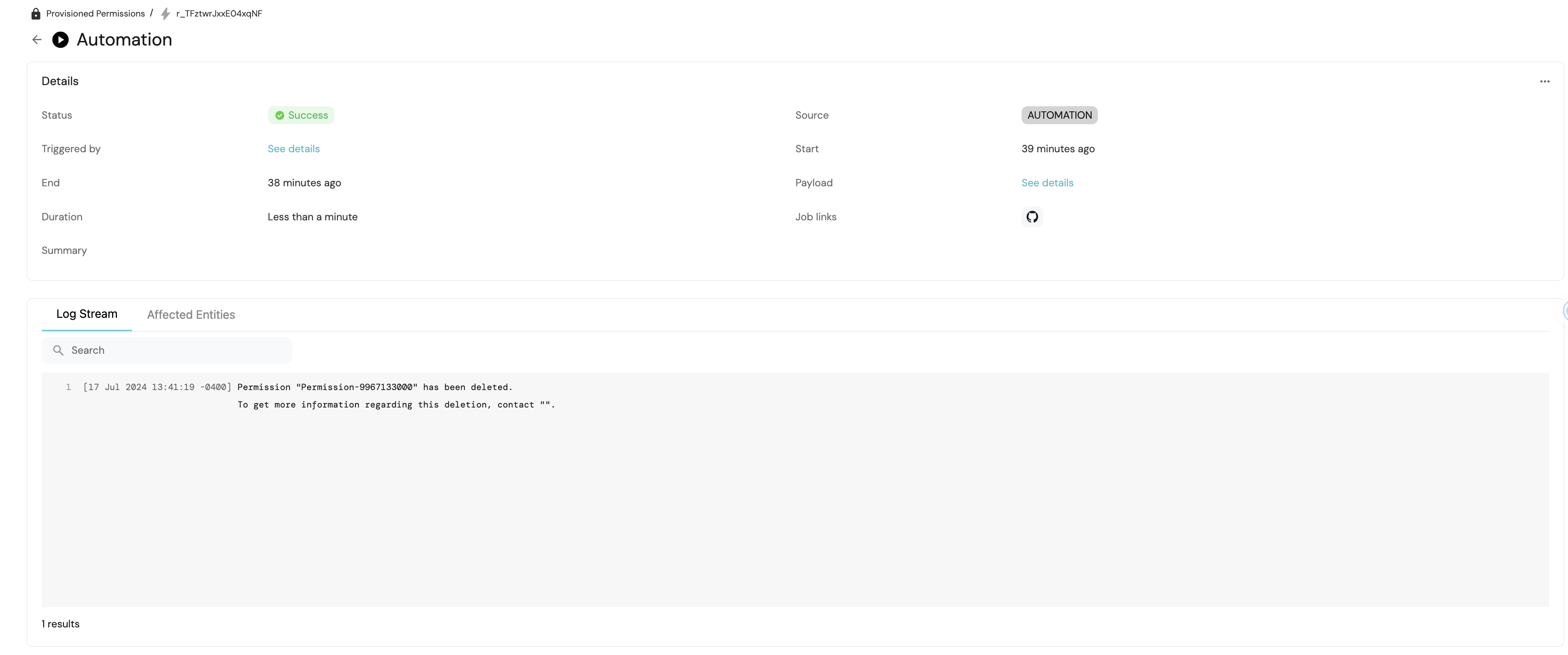 Now, navigate to the Automations tab on the left sidebar. Next, click on the Runs history button located at the top right. Select the latest automation run. You should observe that the automation run completed successfully and the permission was deleted.